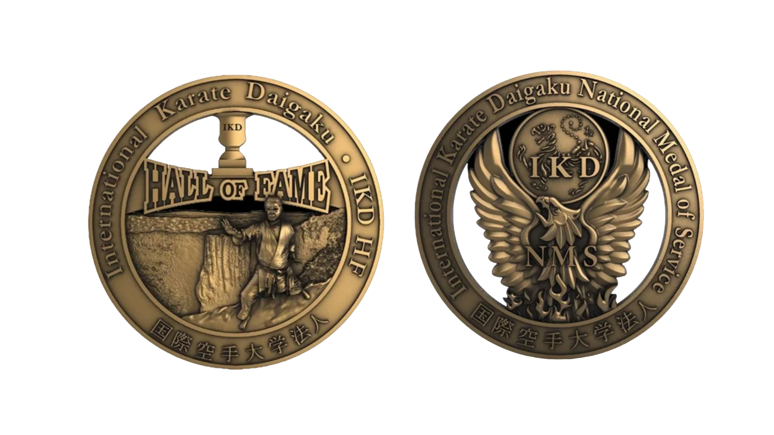 The Phoenix rising from the ashes in the “National Medal of Service Award”, represents 40 years of loyal service Shuseki Shihan Frank Woon-A-Tai gave to his Japanese Masters until his resignation in 2011, with a broken heart and spirit. With the help of true and loyal friends, Shuseki Shihan Woon-A-Tai rose again from the ashes to head the fastest growing karate organization in the world that in seven short years, IKD is represented in 70 regions in 50 countries worldwide. The Hall of Fame Award is a prototype; the final medal will look like the National Medal of Service.