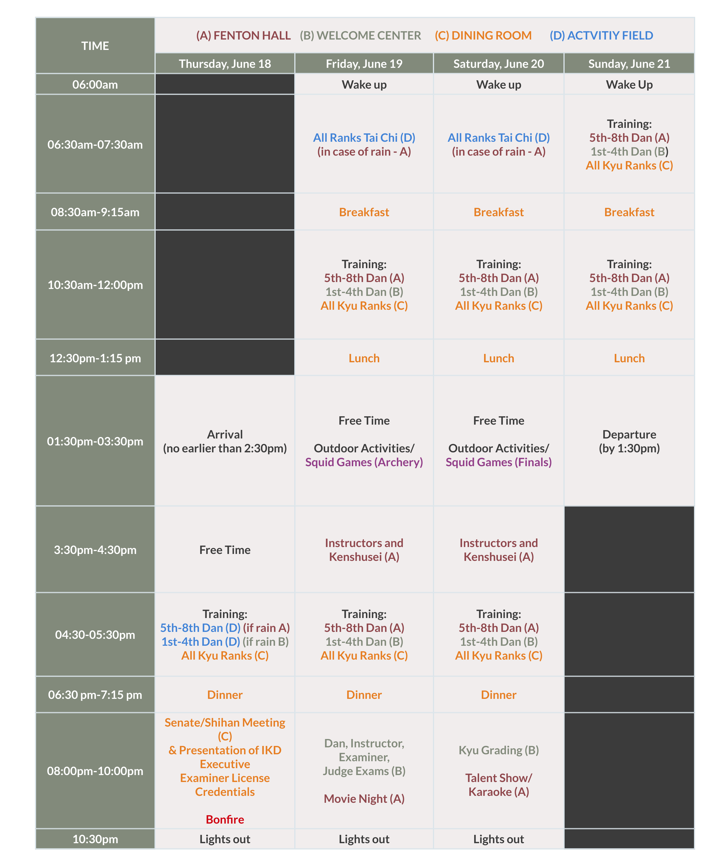 Every aspect of the schedule is designed to inspire, challenge, and elevate your experience. Prepare for an extraordinary weekend of training, community, and adventure.